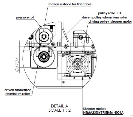 Motion unit its designed simply. We have stepper motor NEMA 23 mounted on holder, holder have slots which are made for correct tension of a timing belt. As mentioned, we used a pulley for transmission between the motor shaft and the rubberised aluminium roller. Pulleys are connected with timing belt. Above driven roller its pressure roller which have function to pressure flat cable on driven roller. The result is: no slipping during cutting.